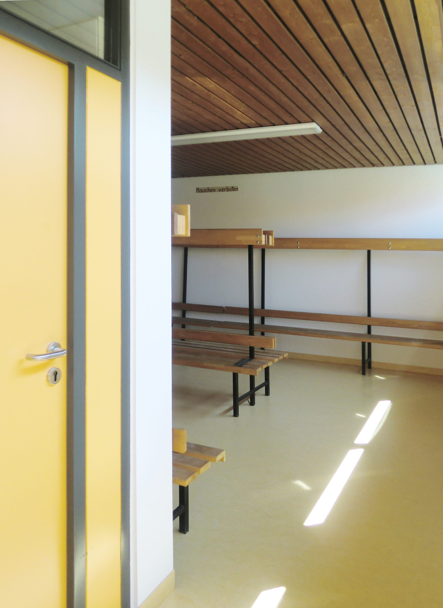 Umbau und Modernisierung der Umkleiden und Sanitärbereiche der Turnhalle aus der 60er Jahren bei laufendem Betrieb in zwei Bauabschnitten: Sanierung der Wand- und Bodenflächen, Einbau von neuen Türelementen und barrierefreien WC-Anlagen, Erneuerung der haustechnischen Installationen.